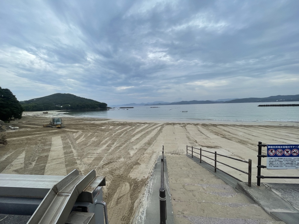 梅雨なのに真夏の気温で、日陰でもクラクラしますよね。近くの海水浴場では砂の整地作業が始まってます。