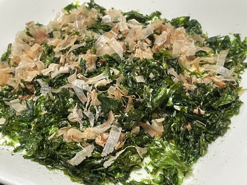 食べる直前に、レンチンしてパリパリを揉み揉みして鰹節と合わせたやつを、たっぷりふりかけてくださいね。