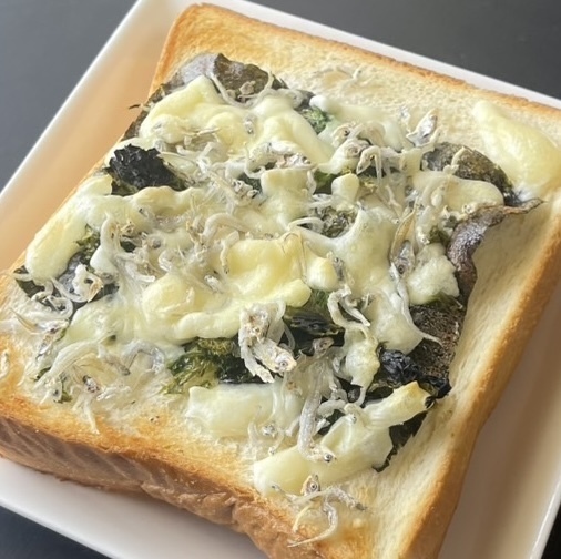 黒海苔とチーズだけ載せて焼いて、食べる時にレンチンあおさ+シラスを乗せてもいい。