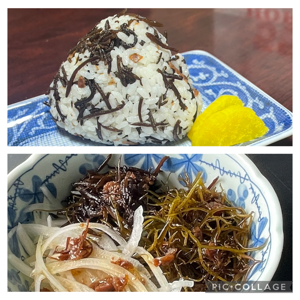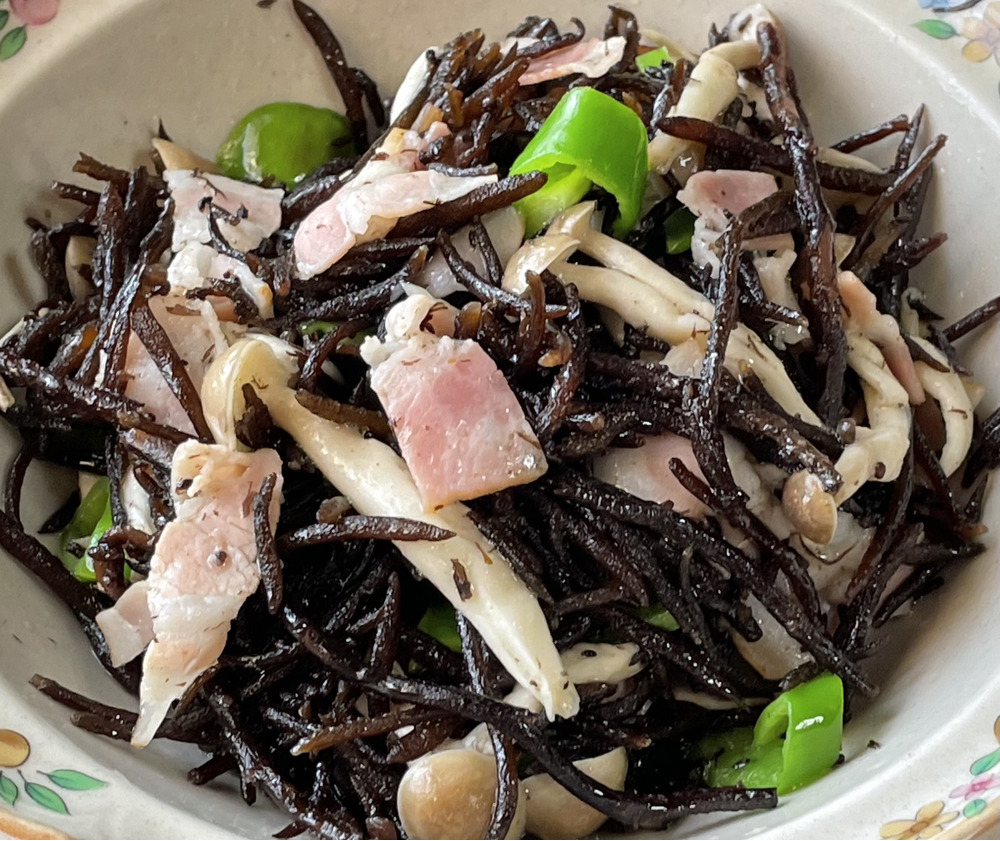 下処理しザクザク切ったひじきを、醤油・砂糖・酒で炒めて梅肉と混ぜたもの。
