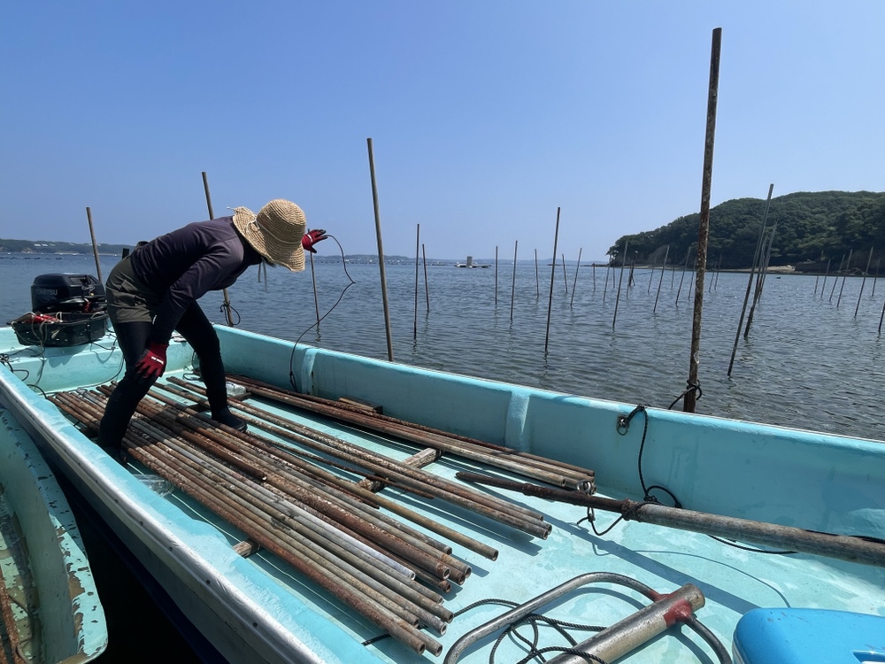 アオサは、天然の種(胞子)を網につけますが、今年は急に海水温が下がったので、タイミングを悩みますね。今日は雨上がりで海水温が低かったので、早速に今年の1番網を投入している生産者もいました。