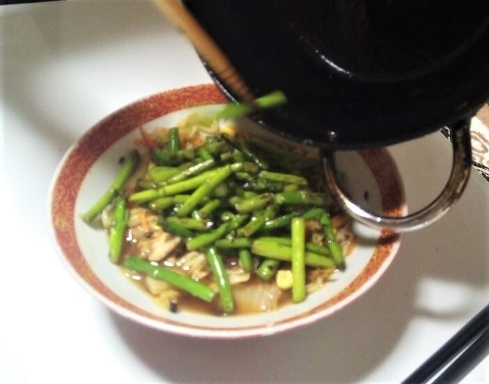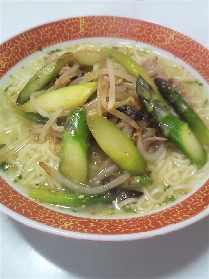 これも簡単。炒めたアスパラをラーメンに載せるだけです。