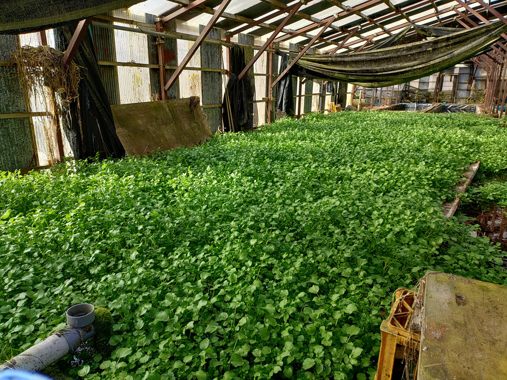 そんな中でもハウスの中ではわさびの花がついております、 まだつぼみですが確実にハウスの中も 春になってます クレソンも育ってます