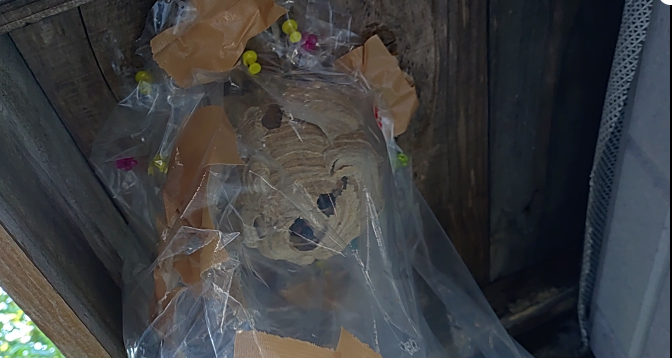 今日の写真は先日 軒下に蜂の巣を作られた その後の写真も載せました、蜂 もなんとか外に出ようと、 蜂の巣に穴を開け 必死にもがいています、 とてもかわいそうになってきますが 、さすがに小屋の軒下だと 駆除しないわけにはいかず、 心が痛みます、何もしなければ攻撃は全然しない蜂ですが やはり 子供達が来る となると何が起こるかわからないので 駆除せざるを得ない 、本当に人間の勝手だなと思ってしまいます。