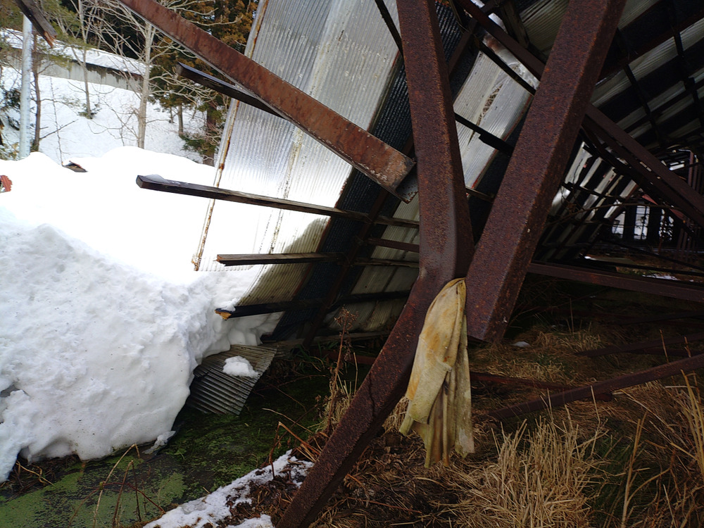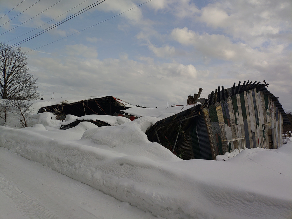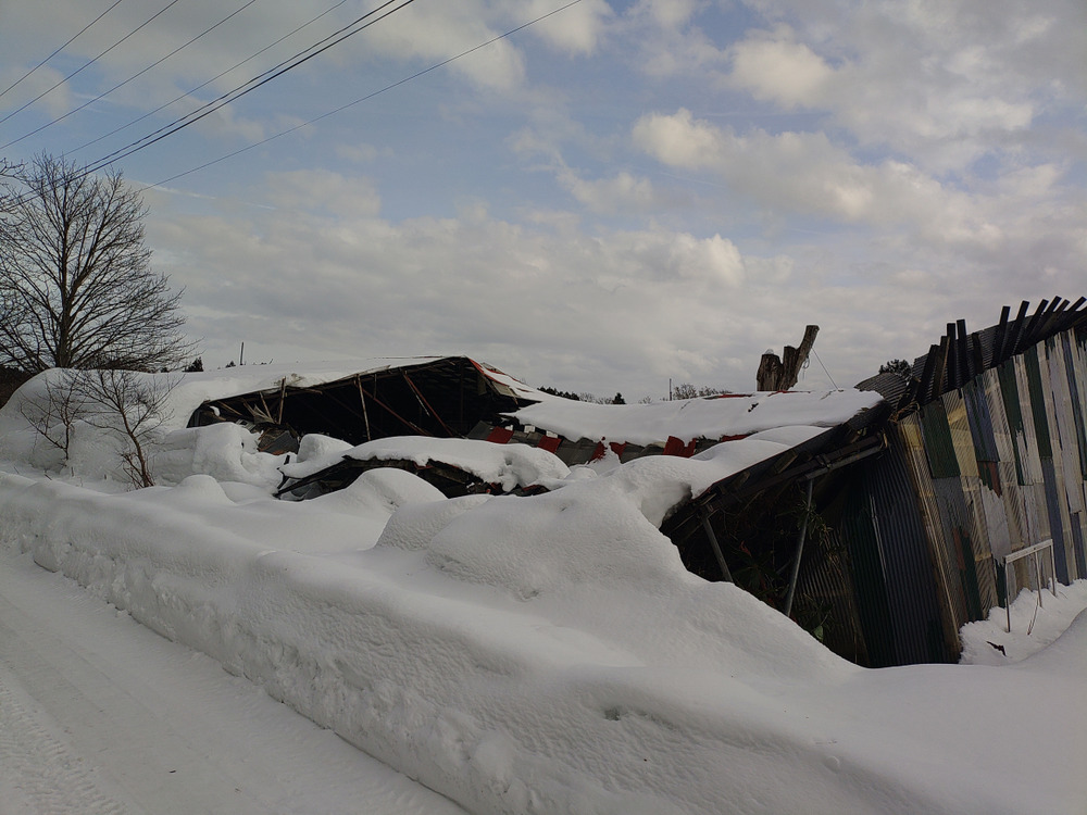 そんな中 先日の雪の重みで小屋が一つ潰れました、皆さんでも安心してください どうせ 壊そうと思ってた 使ってない小屋なので 手をかけなかったら雪の重みで