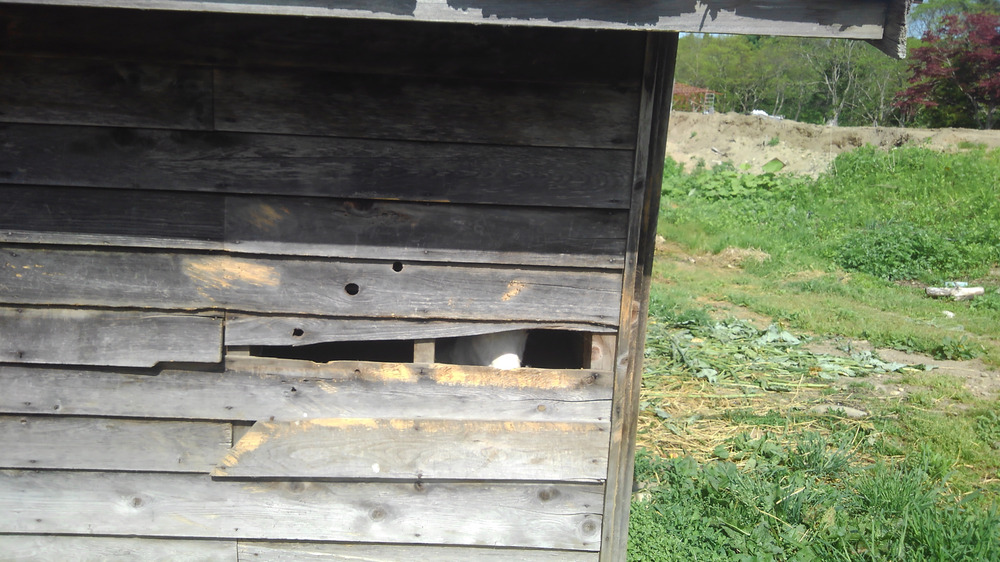 めいが 自分で 何度も頭突きをし 小屋に穴を 明けて早2年 何度も 板を張っても またすぐ穴を開けます😱