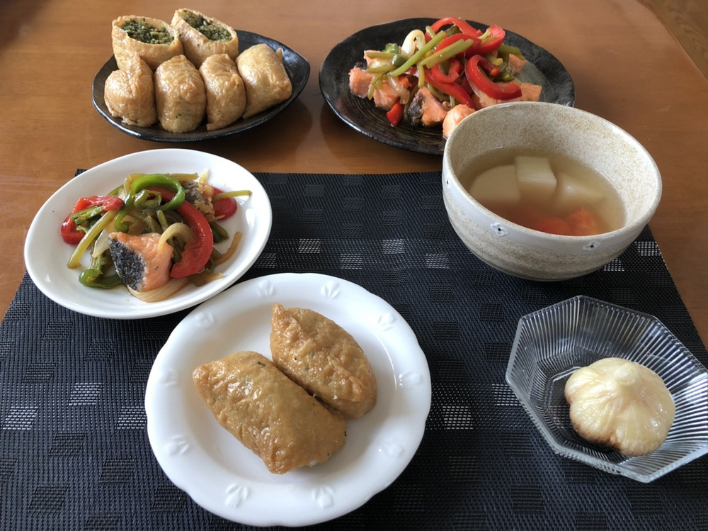 ちなみに わさび醤油漬けを使った わさびいなりと サーモンを使った サーモンの南蛮漬け トマトと こかぶを使った 夏野菜スープ と生にんにくのホイル焼きです