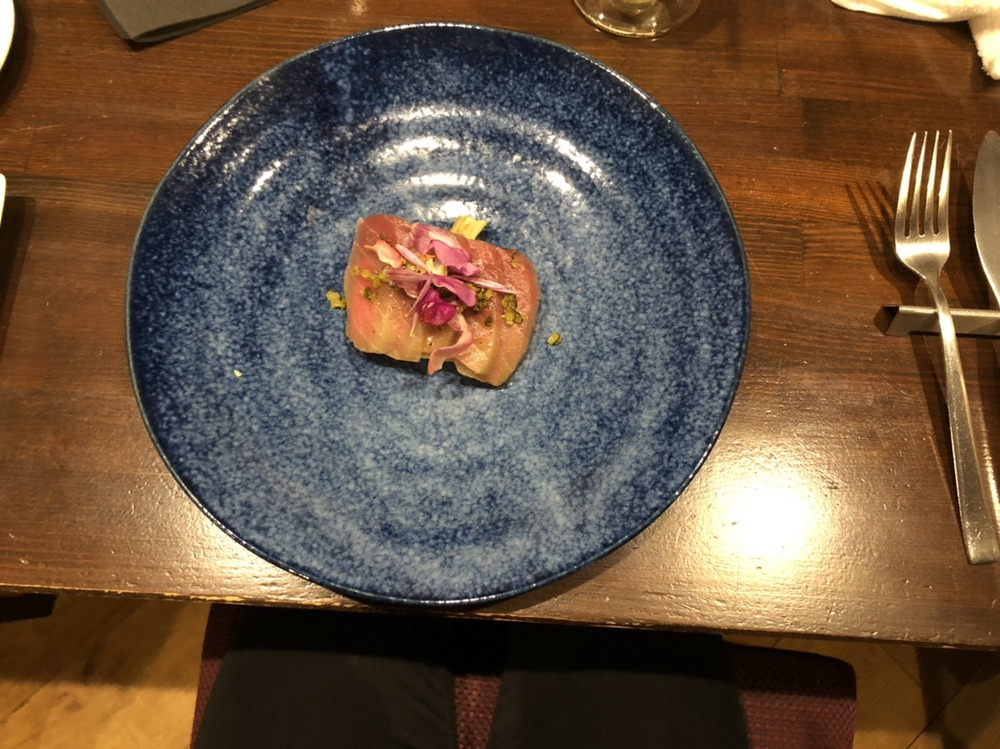 料理の名前は 横文字で 忘れてしまいましたが マグロとタラとイチゴとナメコが地元の 食材です