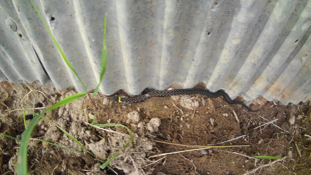 昨日は小屋のところで蛇を見つけました うちの母に見つかると大騒動なので 誰にも言わずひっそりと 見守っていました 首のところに白い線がある蛇です 毒蛇かな?