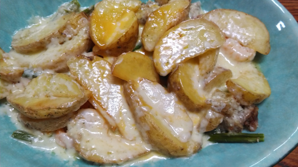 煮豚、ポテトフライ、アスパラ等の上にチーズをのせてレンジでチン。