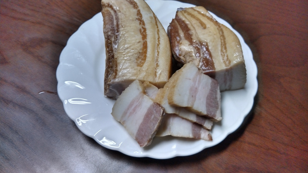 発色剤、保存料を使わないオールドベーコン、作りました。