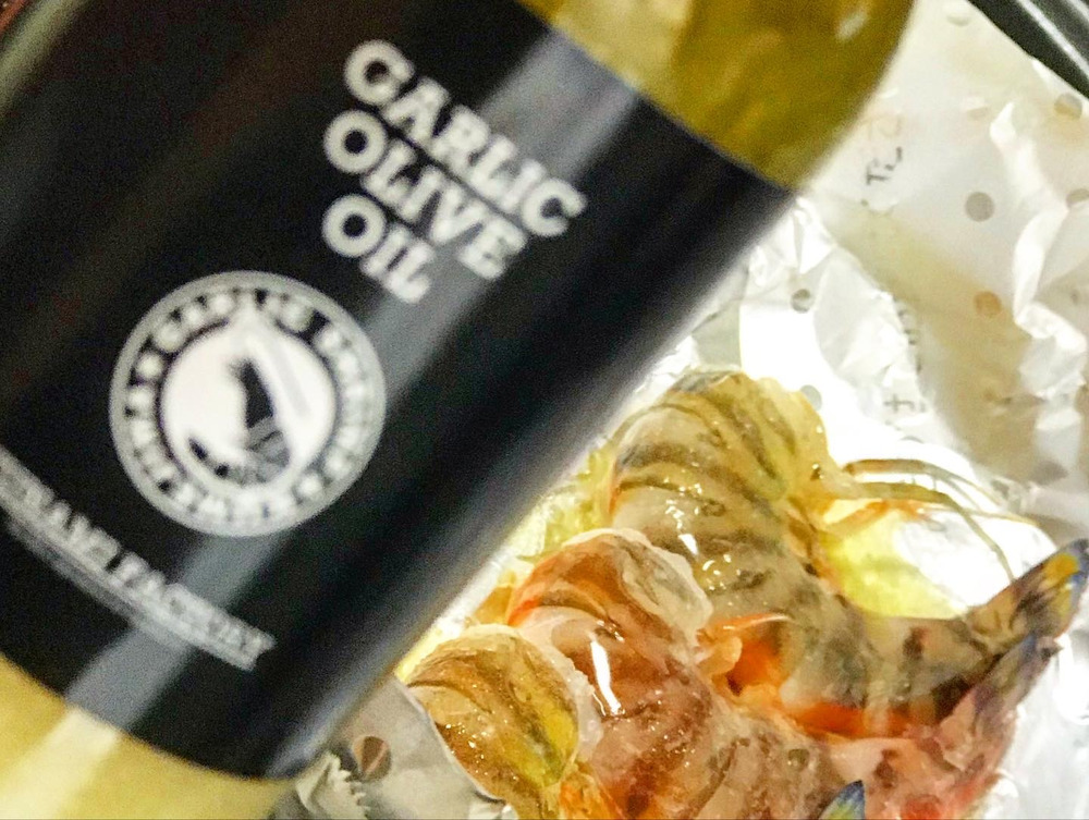 弊社の車海老と、沖縄久米島で大人気のユナミファクトリーさんのPB商品”ガーリックオリーブオイル”を使って料理してみました!!