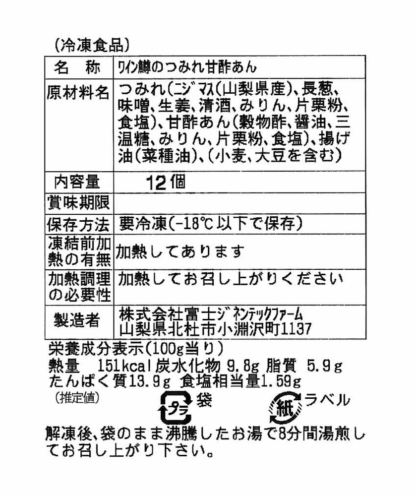 【富士の介の竜田揚げ】、【ワイン鱒のつみれ甘酢あん】が含まれていますが、おかず便の商品ページに原材料名が記載されていなかった為、