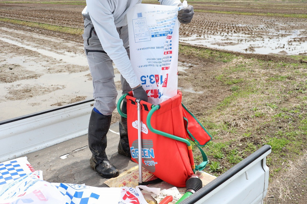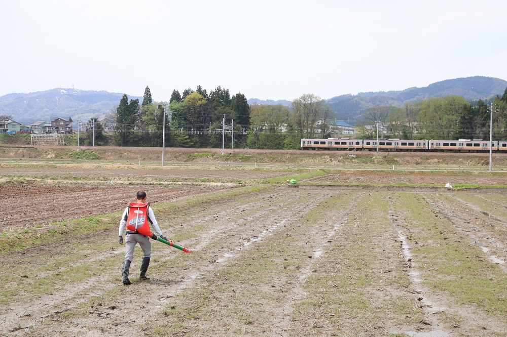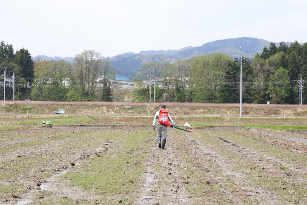 この広い田んぼを一つ一つ地道に撒いていく作業。