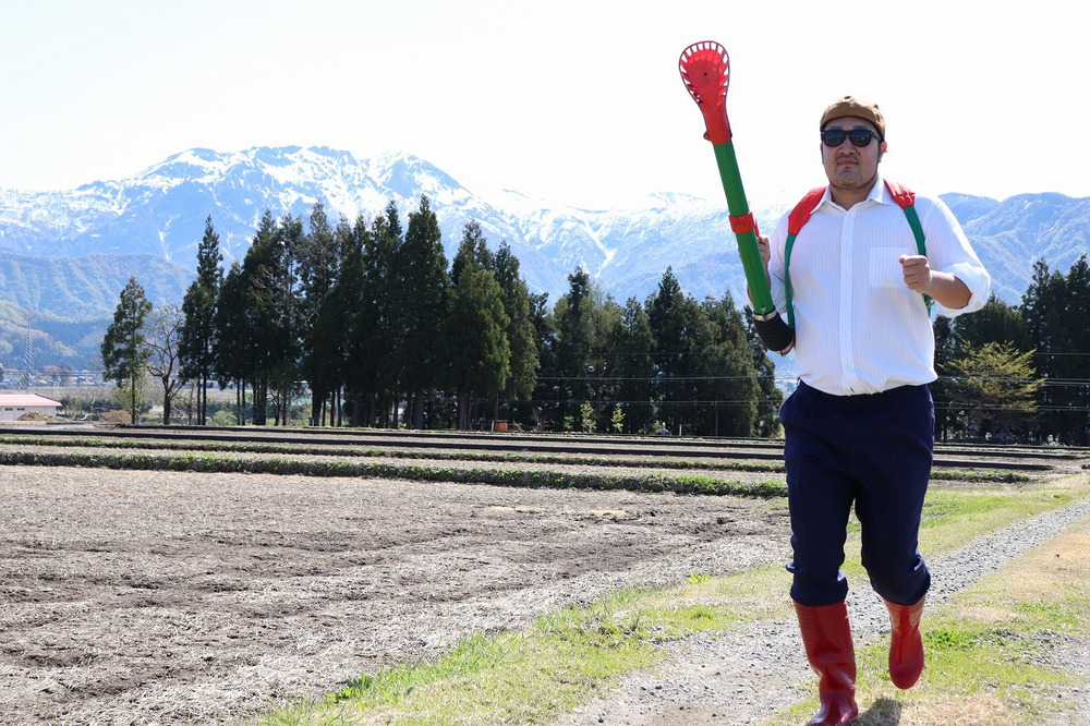 トーチを肥料撒き機に変え、聖火ランナーをパロディーした社長です😎