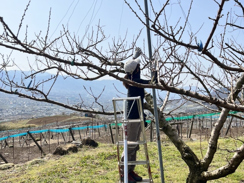 摘蕾とは桃の木のつぼみを落とす作業になりますが、余分な蕾は間引いていきます。