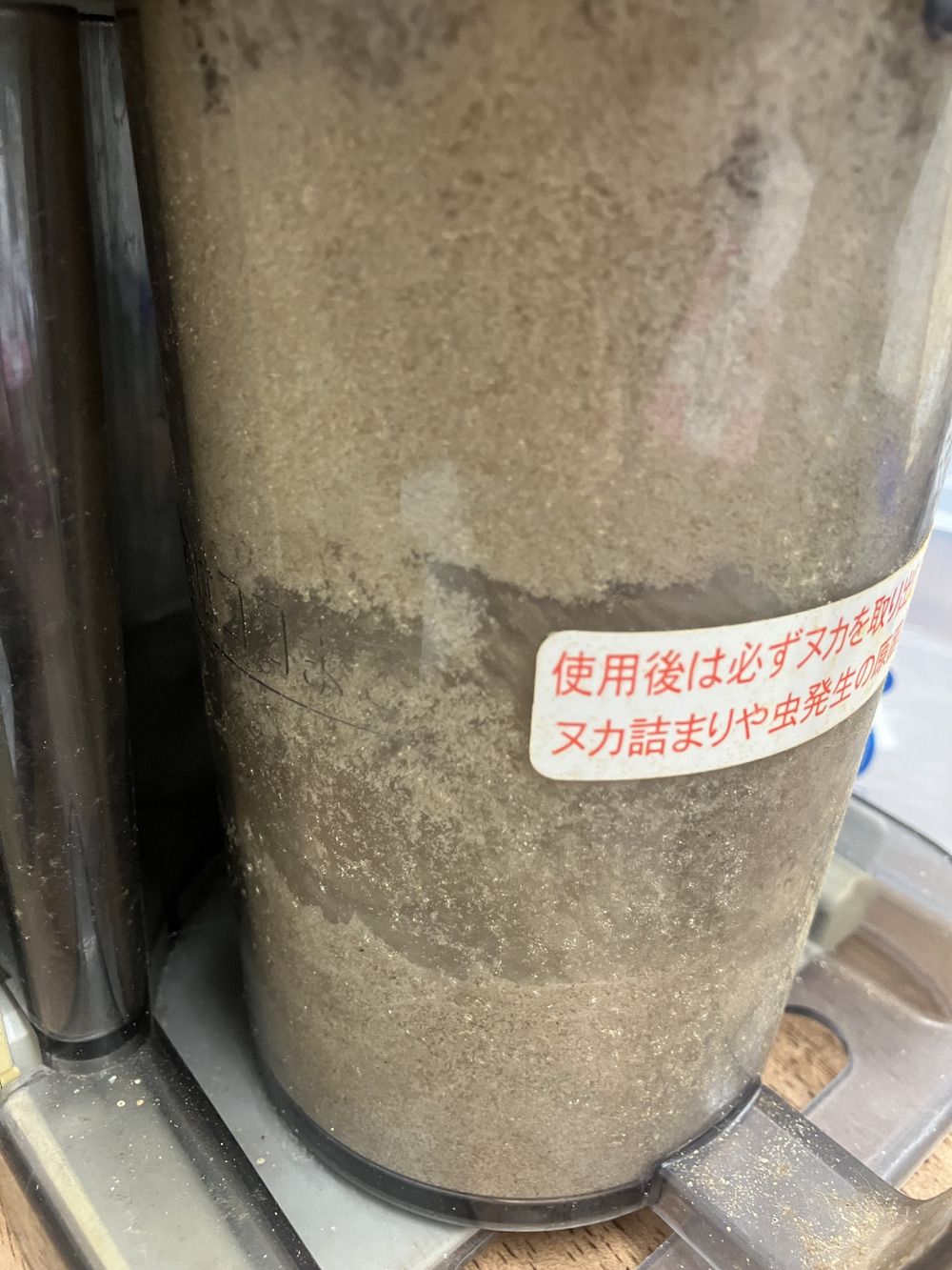 20年ほど前の機械のようですが、現役で動きます。精米した後に出る糠(ぬか)は、ふりかけにしています。