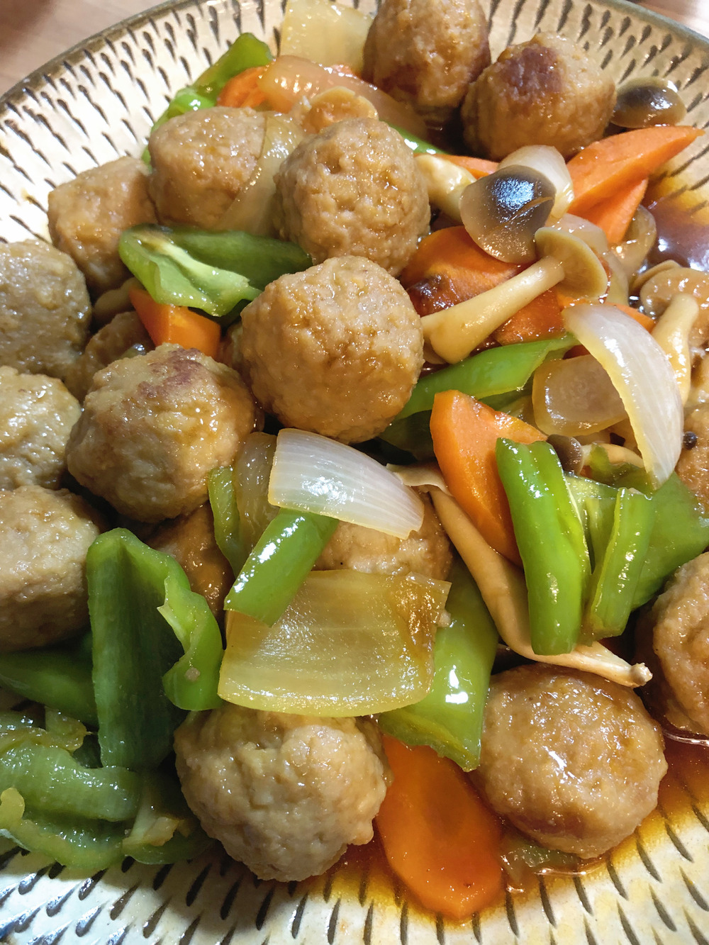 ・ピーマン、にんじん、玉ねぎ入り酢豚風肉団子炒め(冷凍肉団子なのはご愛嬌で…🤣)