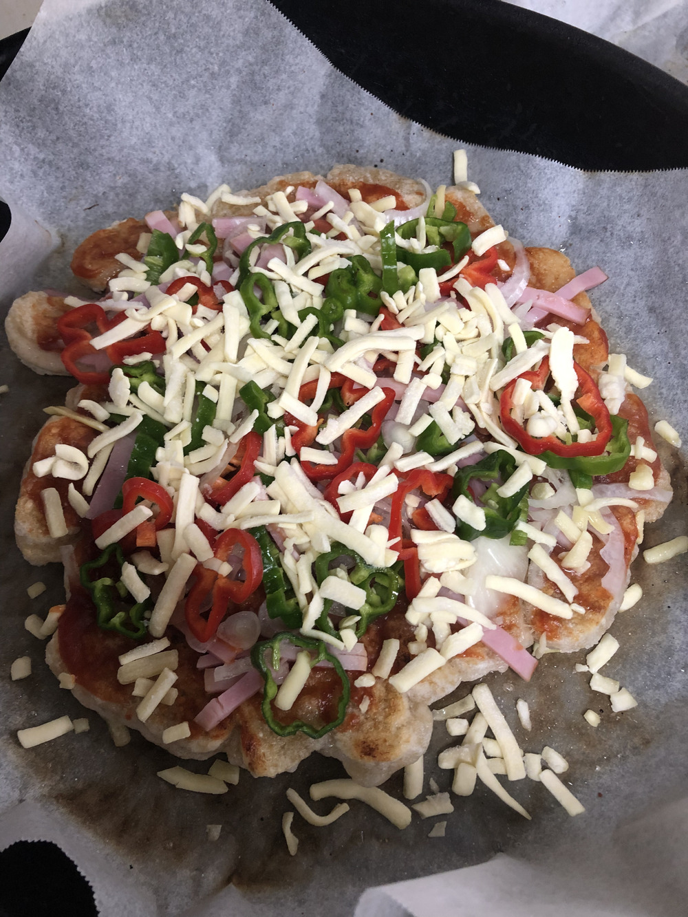 カットしたお餅をまず油で焼いて、少しぷくっとしたらひっくり返してケチャップ塗り野菜とチーズ、蓋をしてしばらく火にかけたら出来上がりです!なんと簡単な!笑