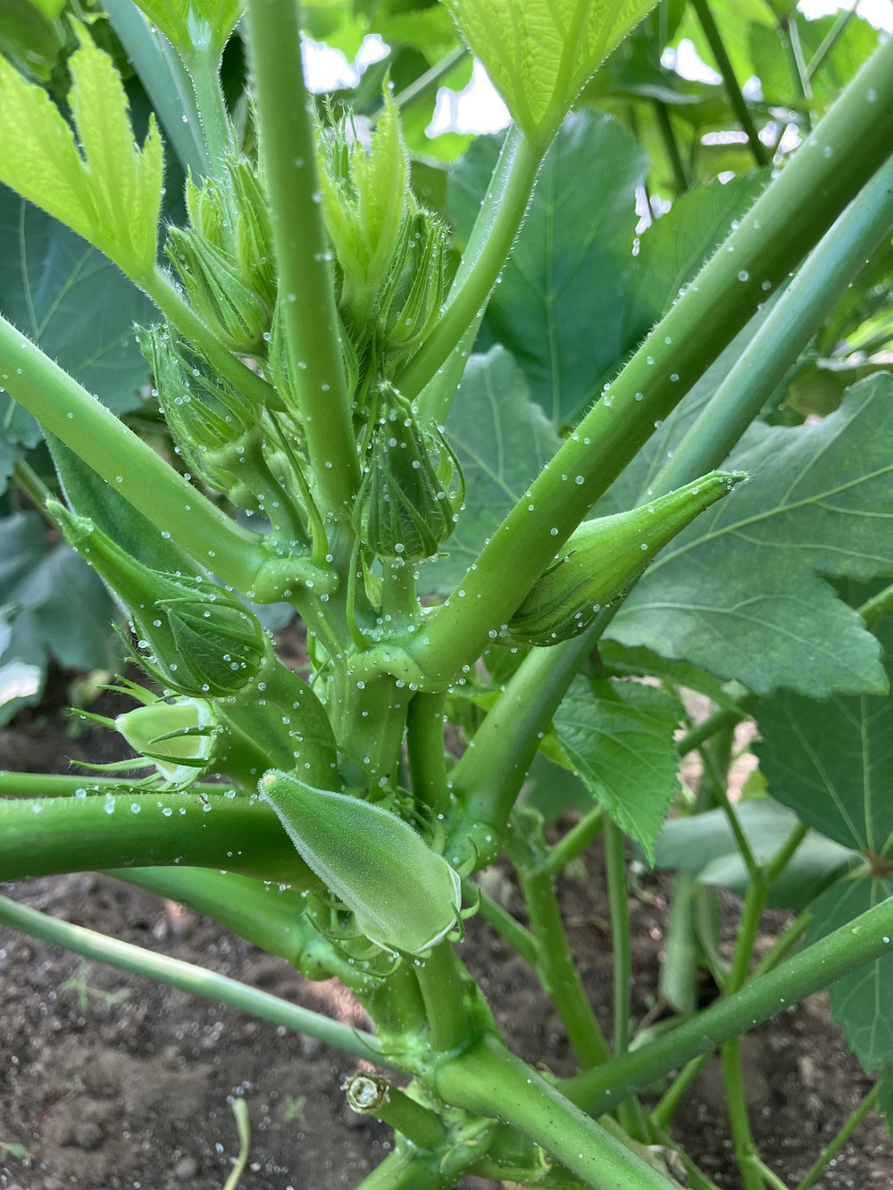 茎や葉の裏などには透明のつぶつぶがつくのですが、実はこれオクラのネバネバ成分由来のものなんです。