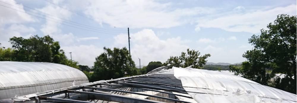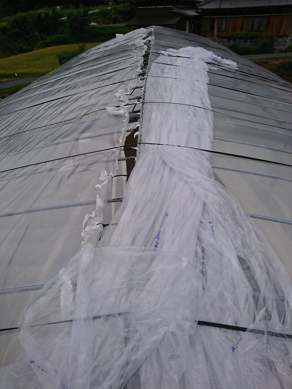台風10号の強風によってビニールハウスの天井部分が見事に破けてしまいました(´;ω;`)