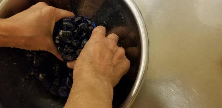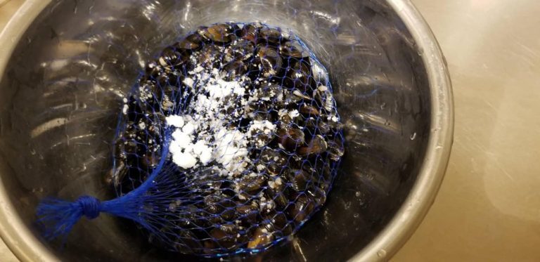 ①しじみを塩揉みして殻の汚れを落とし、ささっと水洗い。