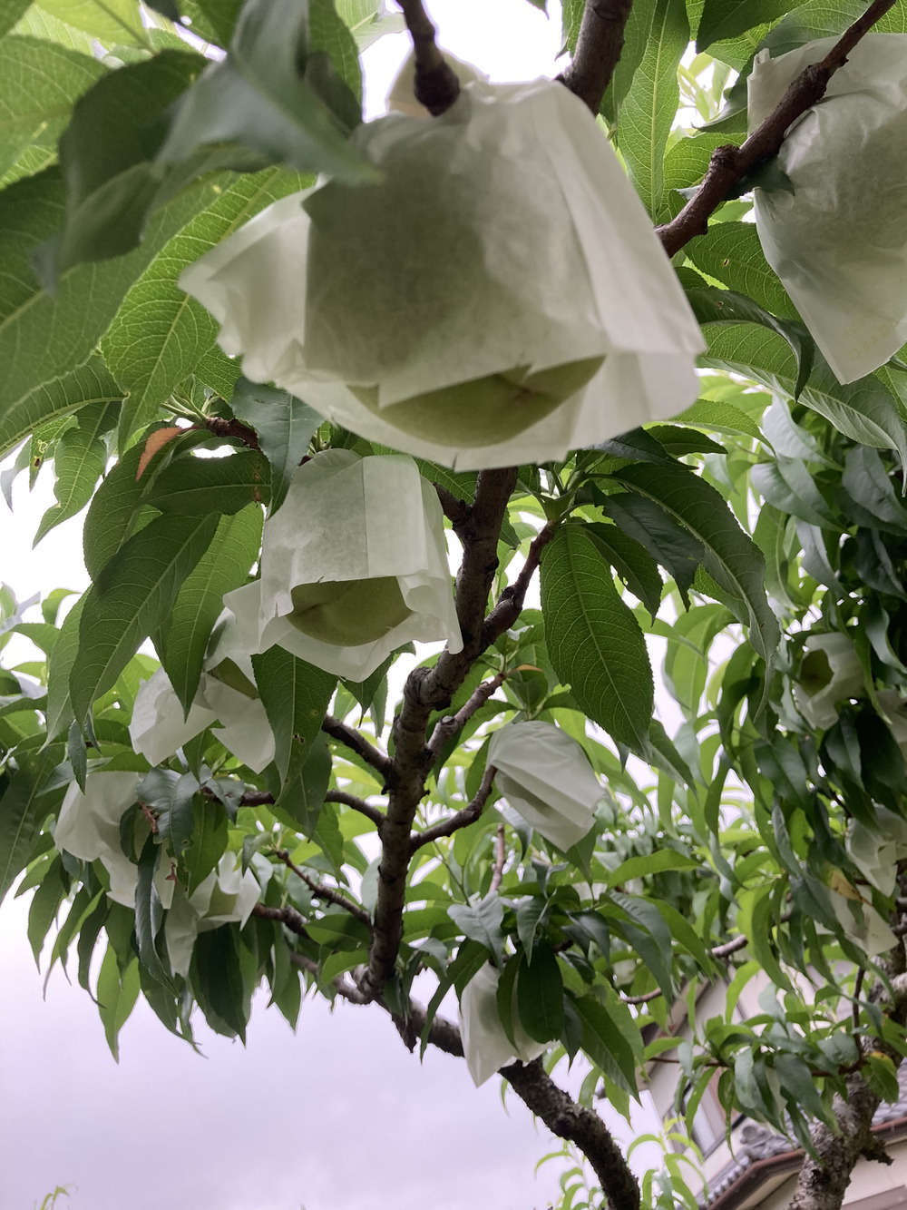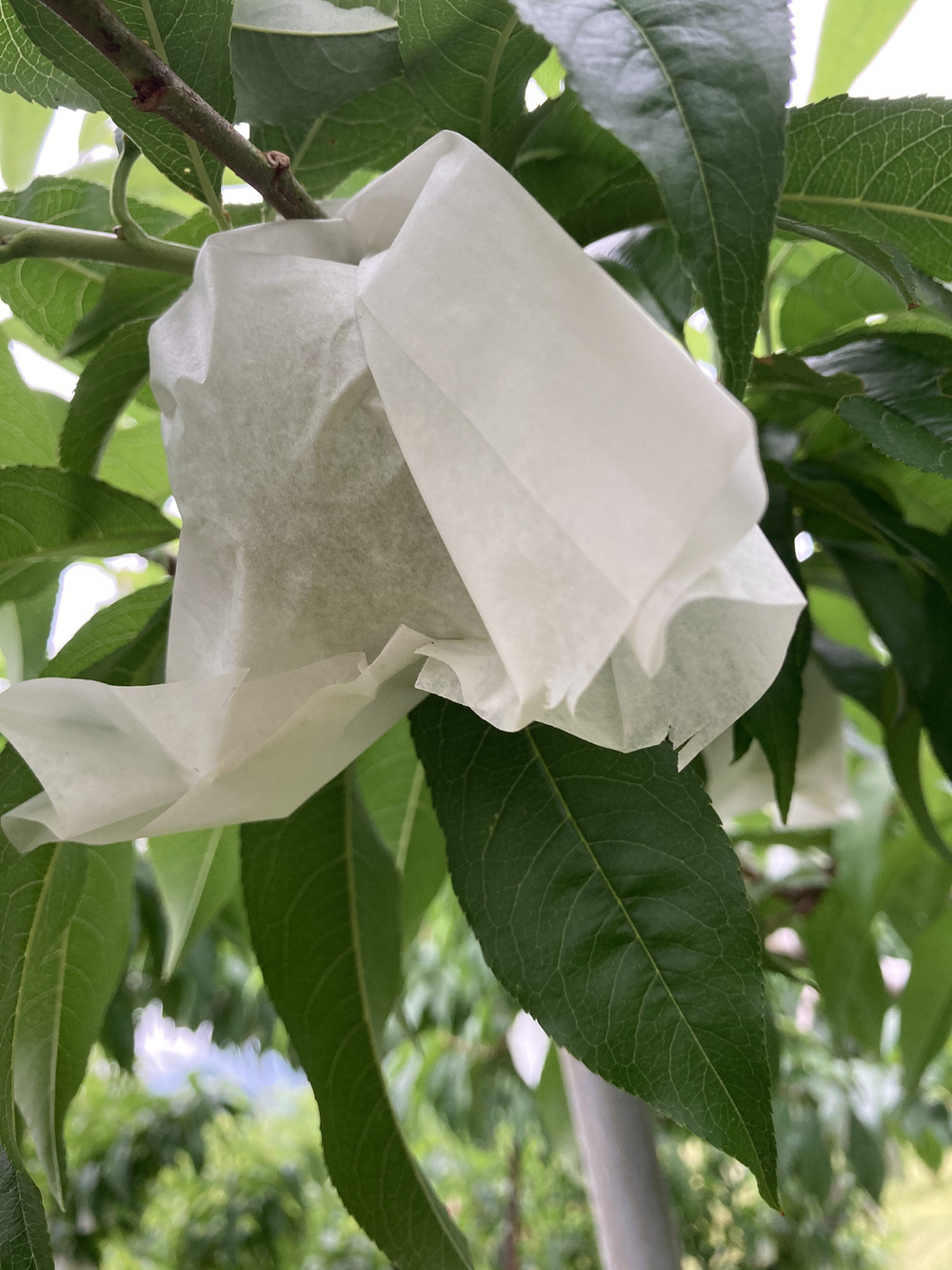 桃も順調に肥大しています。こちらは日川白鳳という、当園の桃のトップバッターですが、自らの肥大で袋の口を開けています。