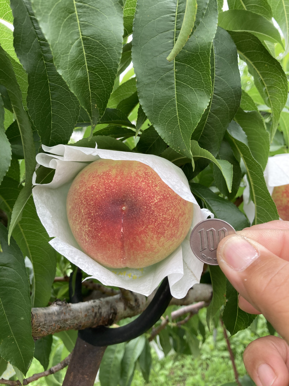 と、いうわけで桃も生育順調です。こちらはトップバッターの日川白鳳。早生種なので超特大!!とはいきませんが、この1.5倍くらいにはなるかな?というところでしょうか。