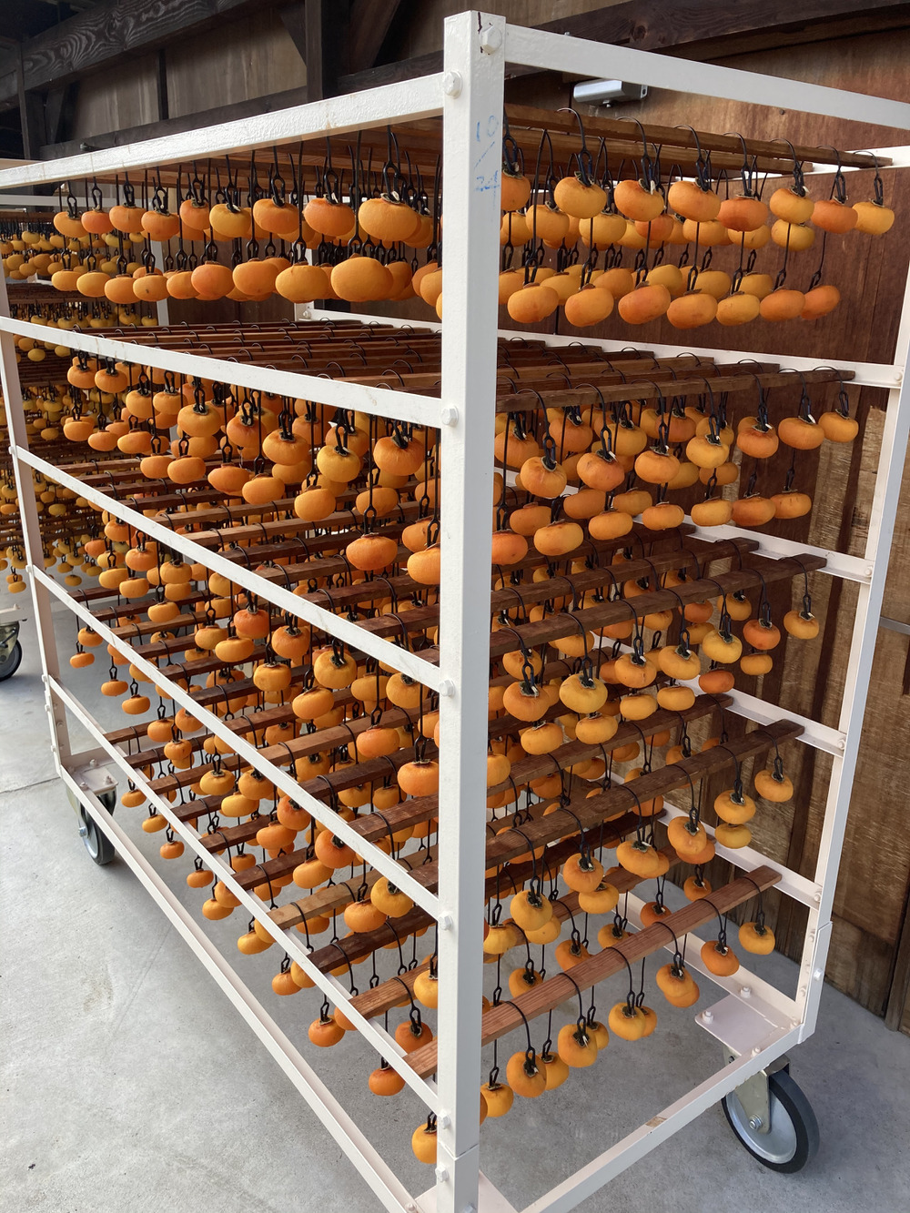 渋柿の皮を剥き、硫黄燻蒸し、天日干しとボイラー室にて干して完成させる『あんぽ柿』という、山梨県南アルプス市特産のものです。