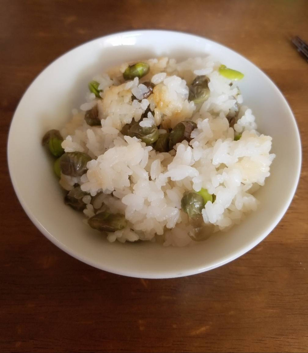 そして、炊き上がったら、さやから取った豆を入れて混ぜて完成!!