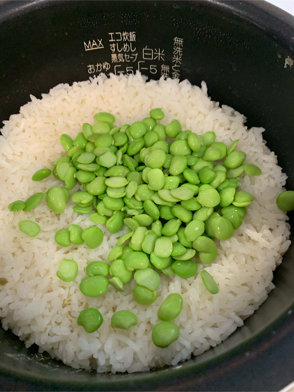 ダシでご飯を炊いて、薄皮を剥いただだちゃ豆を炊き上がったご飯に混ぜて