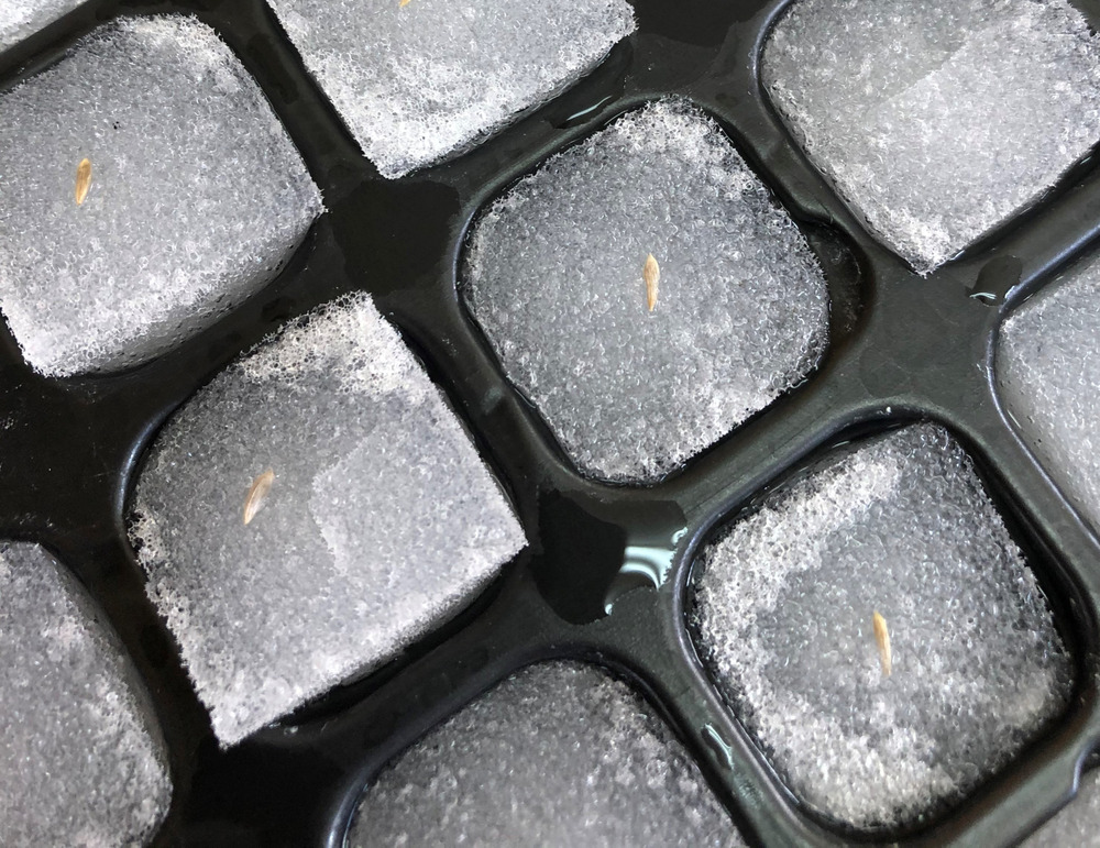 水耕栽培では写真のスポンジに種をまきます。真ん中に切れ込みがあるので、そこに半分程度種が埋まるようにまきます。ピンセットを使っての細かい作業です。