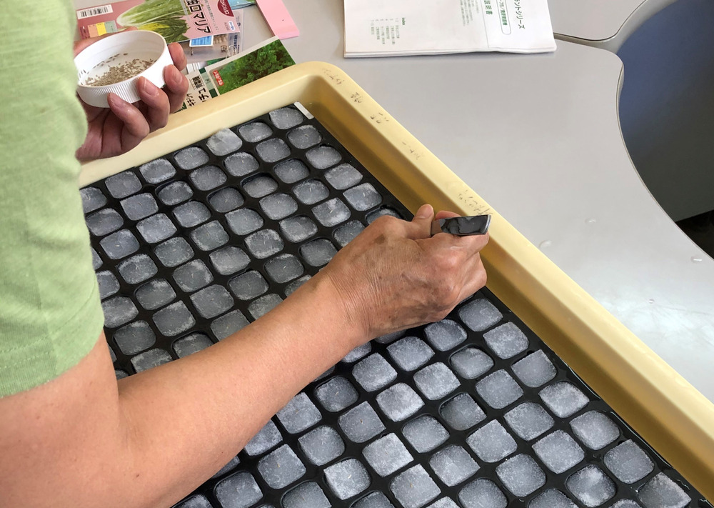 水耕栽培では写真のスポンジに種をまきます。真ん中に切れ込みがあるので、そこに半分程度種が埋まるようにまきます。ピンセットを使っての細かい作業です。