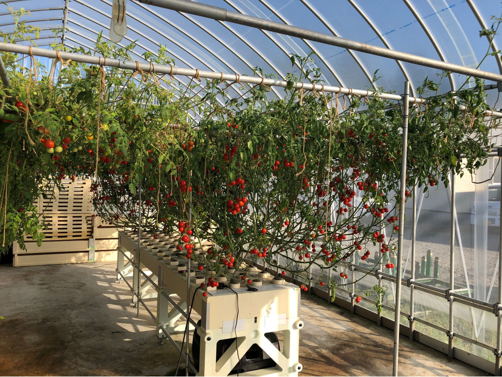 一般的にトマトは脇芽を欠いて育てますが、水耕栽培のトマトは葉を欠いて育てます。そうすることで繁茂しすぎることを防ぎ、日光がまんべんなく行き渡るようにします。