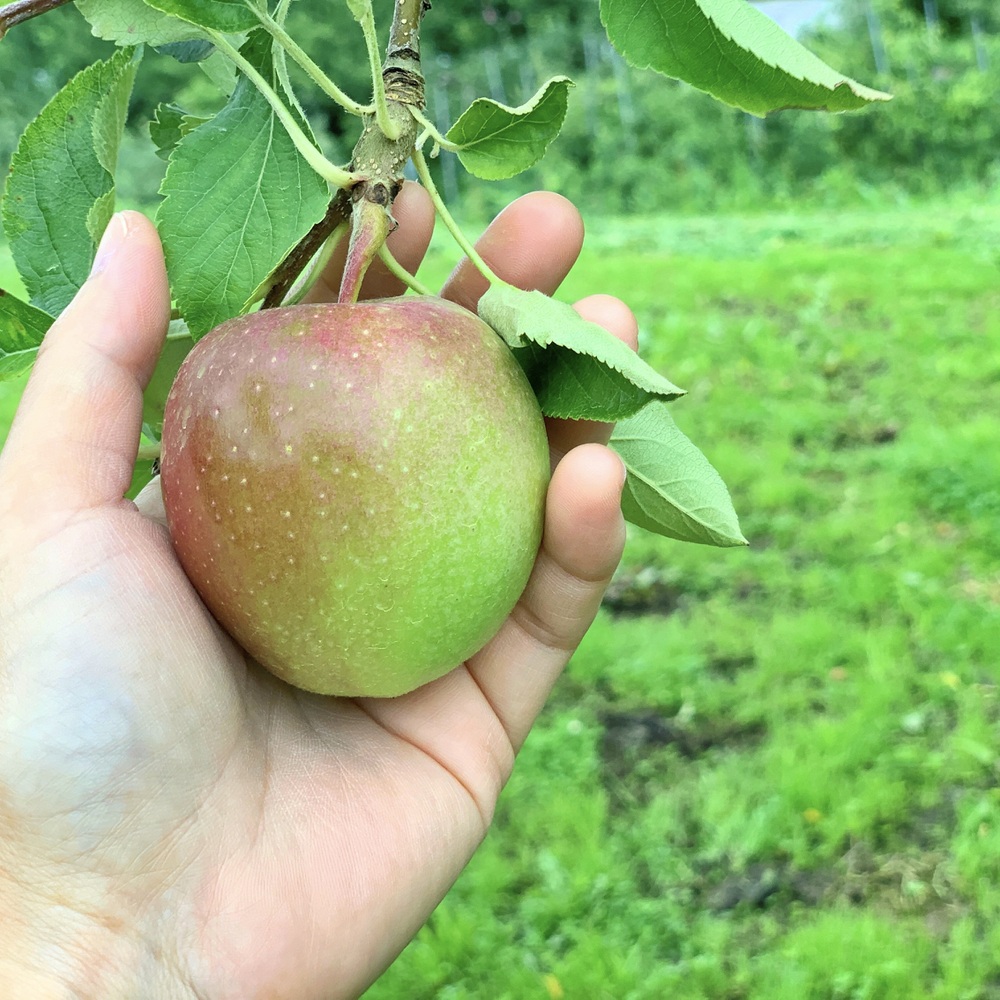 岩手県にあるりんご園のりんごは、今このくらいの大きさ。
