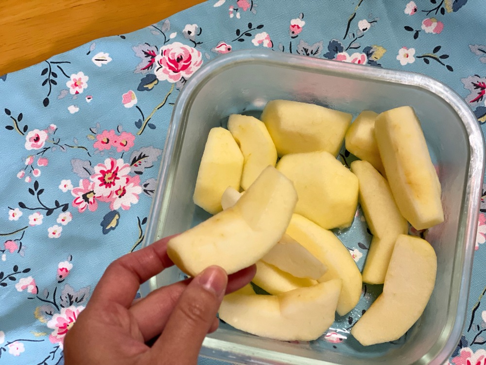 今日の朝ごはんは、ちょっとモサモサしてきたりんごを。シャキシャキも良いですが、実はモサモサも好きです♪
