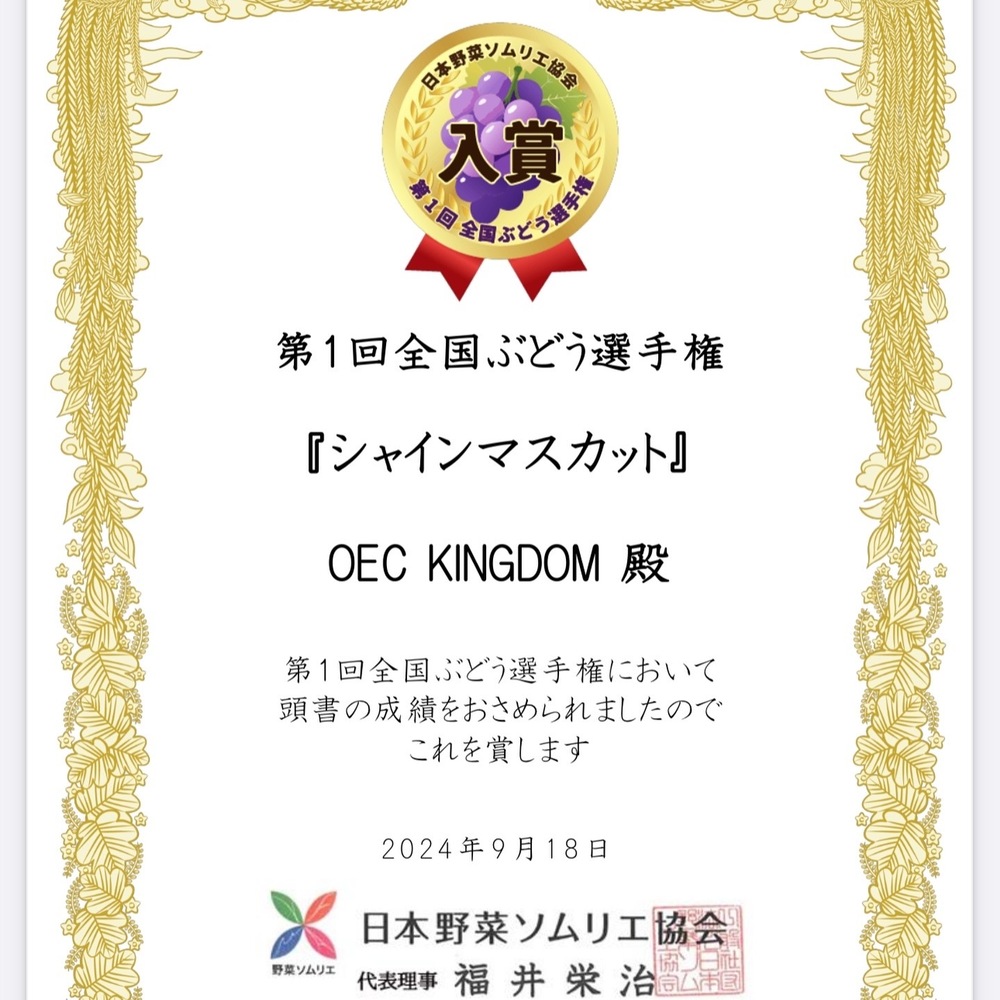 第1回全国ぶどう選手権にてOEC KINGDOMのシャインマスカットが入賞を受賞いたしました!