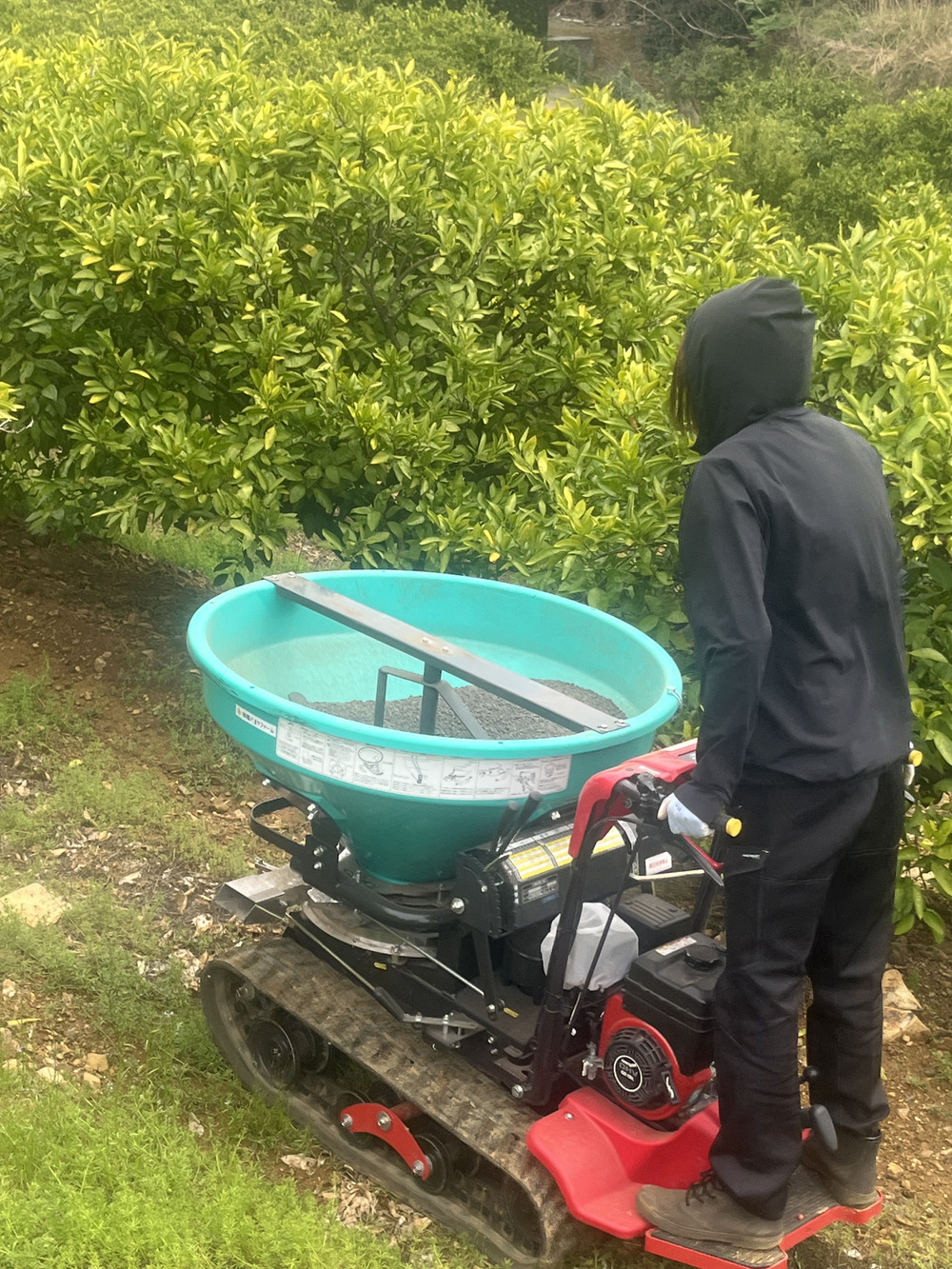 斜面を上り下りしながら一樹ずつ肥料をまいていきます。