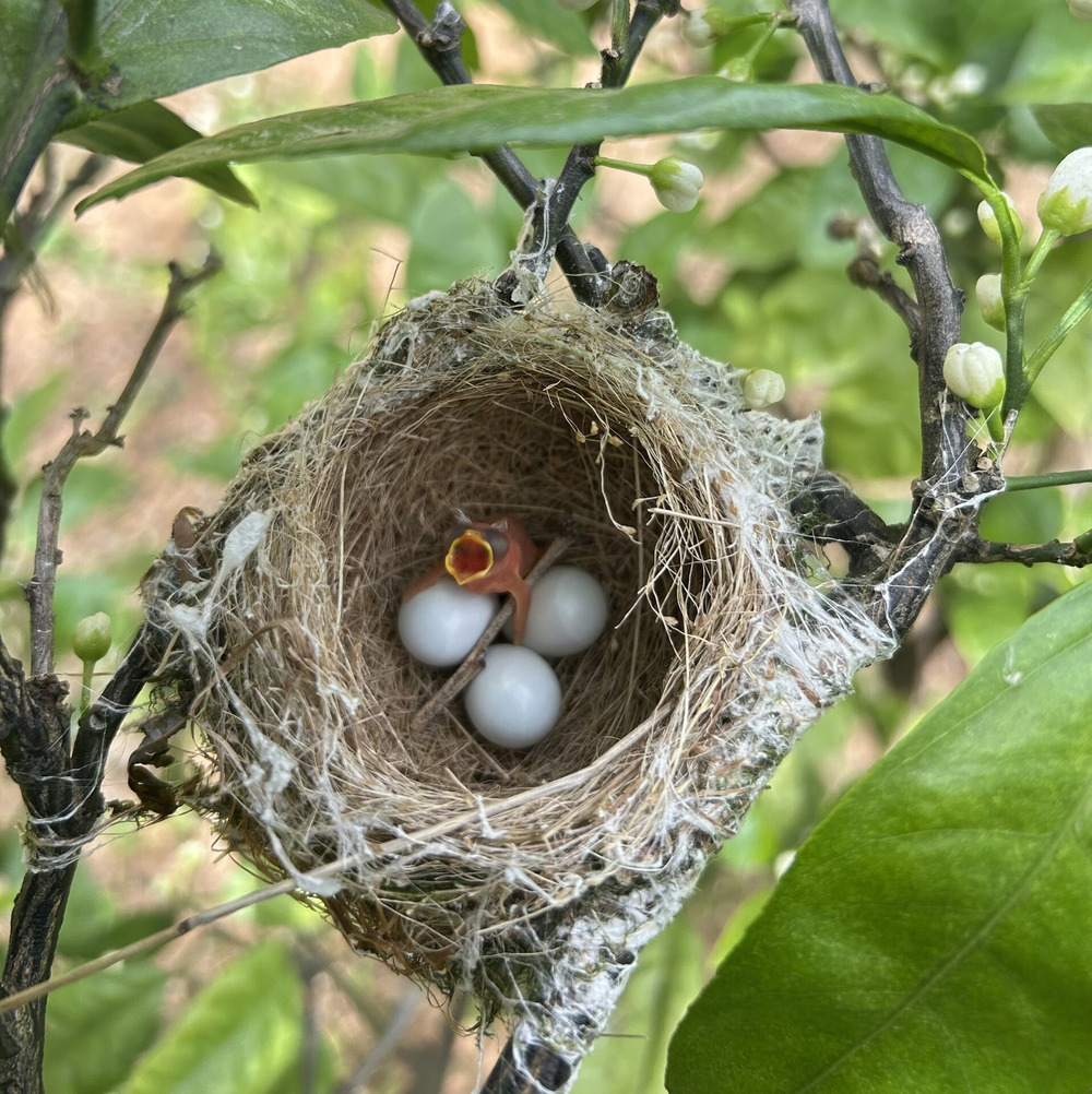 そっと覗くと、そこにはかえったばかりのヒナたち。殻の残る卵と、まだ羽も生えそろっていない小さな体が、静かにそこにありました。