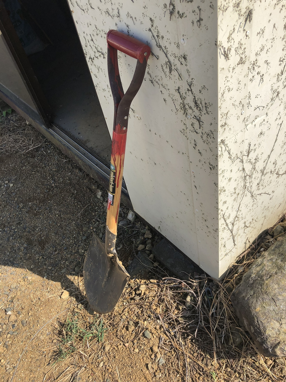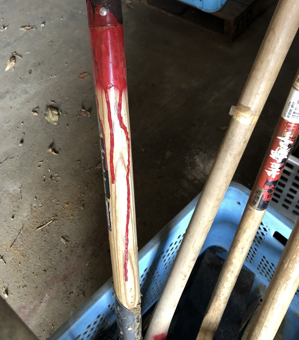 目印に赤いスプレーをつけたのですが、ホラーなスコップになってしまった。