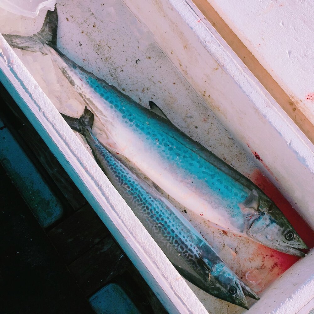 船上に上がった鰆、どったんばったん暴れまくるのを抑えて、出刃包丁で一気に脳天締め。次にエラを切って血抜き。その後は海水の入ったバケツに頭から突き刺して5分ほど血抜き。最後に氷締め。