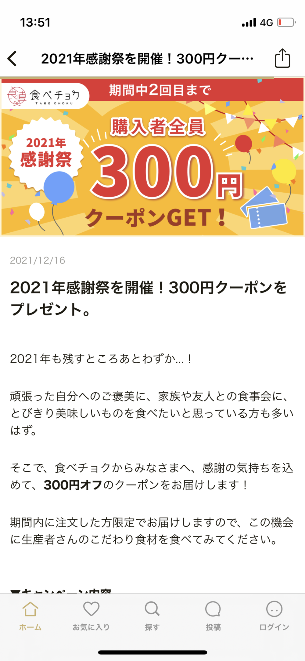 食べチョクさんが300円クーポンをプレゼントしてくださるようです🎁