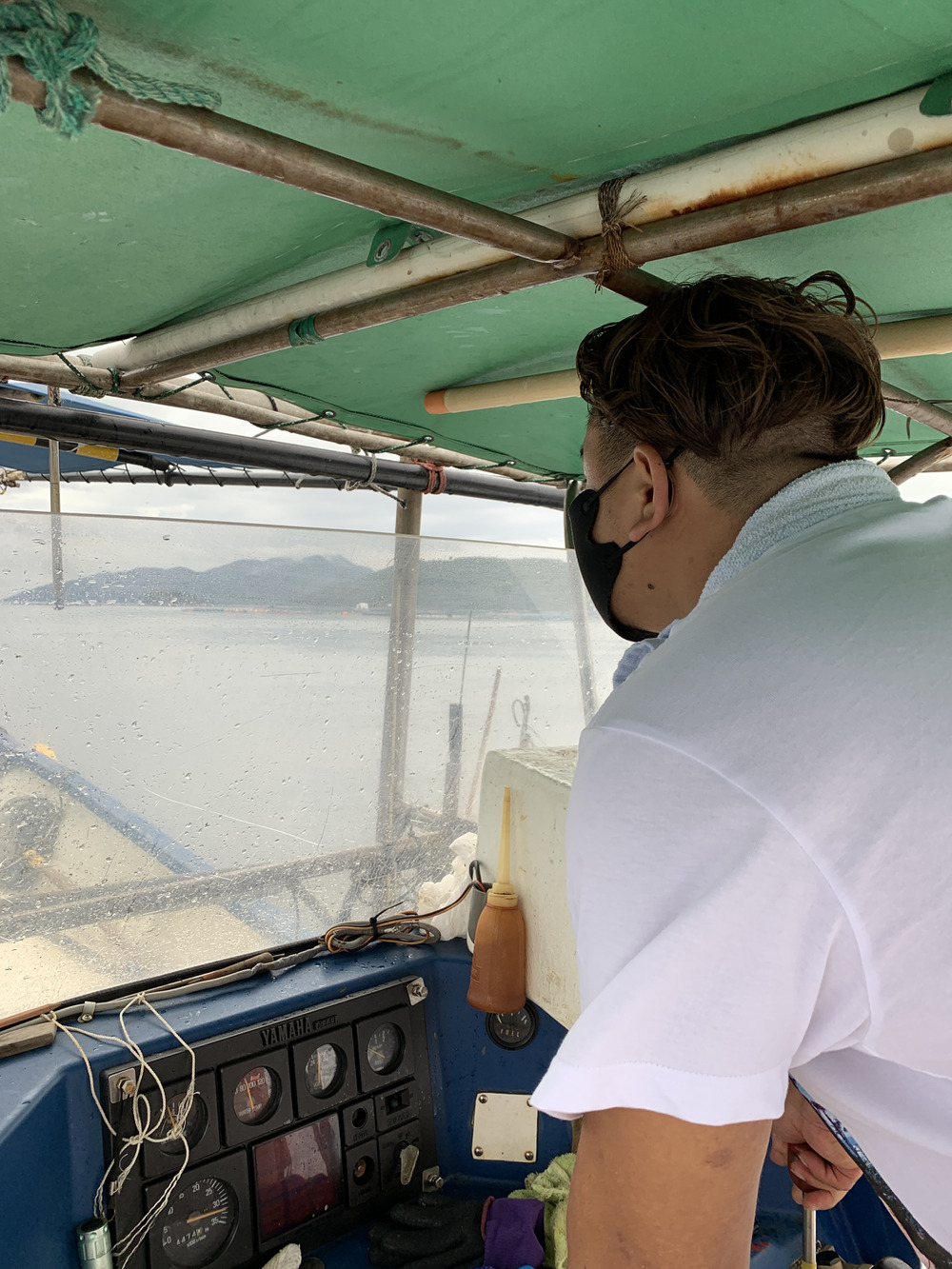 ただいま、漁船で荷物を本土まで運搬中。