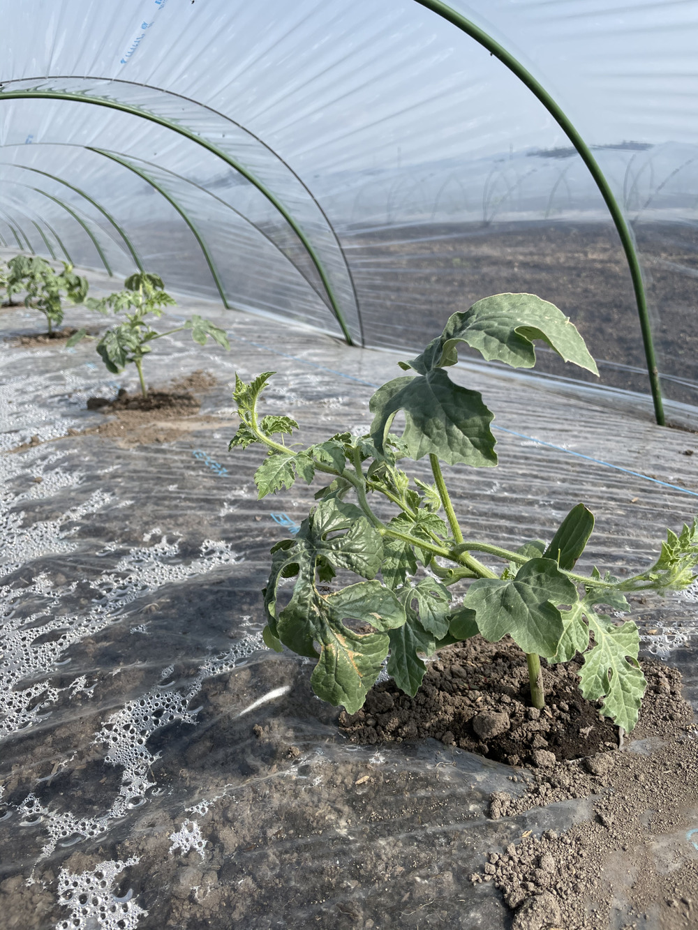 すいかの成長も早いもので、植え付けからひと月ほど経ち、わき芽とりと芯とめの作業をしています。