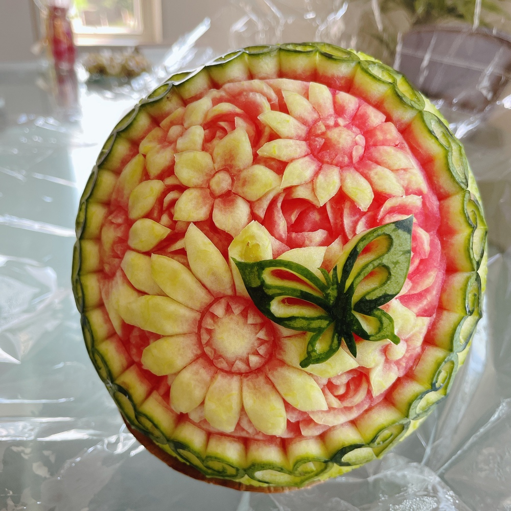 写真は、すいかにフルーツカービングをしてもらったものです。芸術品にテンションが上がりました😆☀️