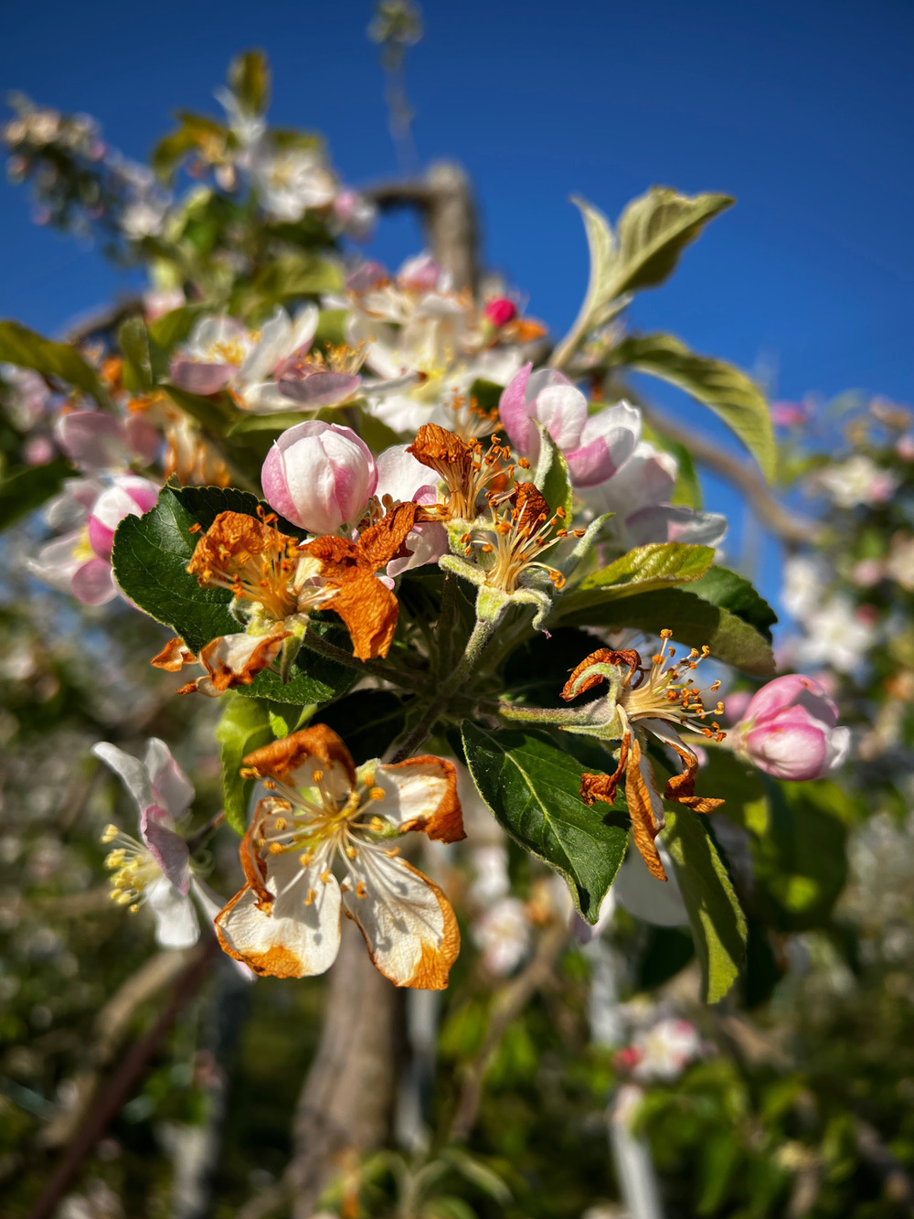 27日の朝4時くらいに一部圃場のりんごの花と実は凍っていました😅
