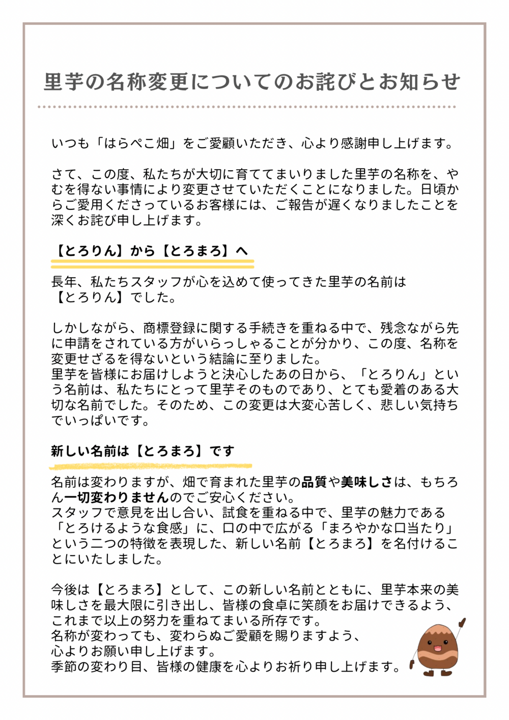 たくさんの皆様に「とろりん」という愛称で呼んでいただいて頂いたのにも関わらず、私たちの申請が通らず名称変更となりましたことをお詫び申し上げます。