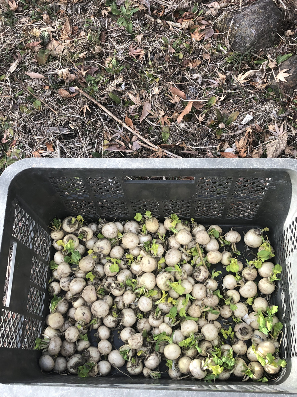 このカブ達も少しずつ柔らかくなってきていますが、まだまだ食べることは、できます。(土を落とさずカゴに入れて新聞紙をかけて保存しています)