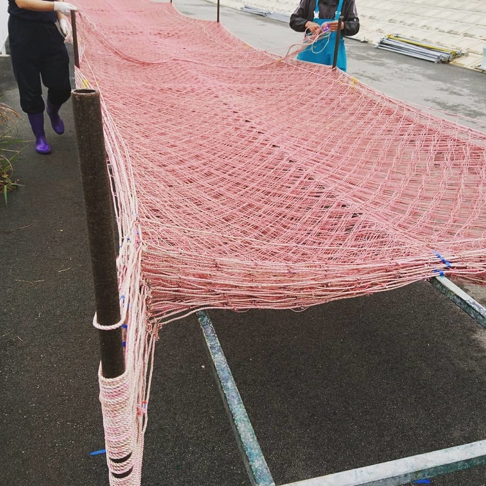 海苔養殖を終えて持ち帰った海苔網は、きれいに洗って破れた箇所を補修糸で修繕します。