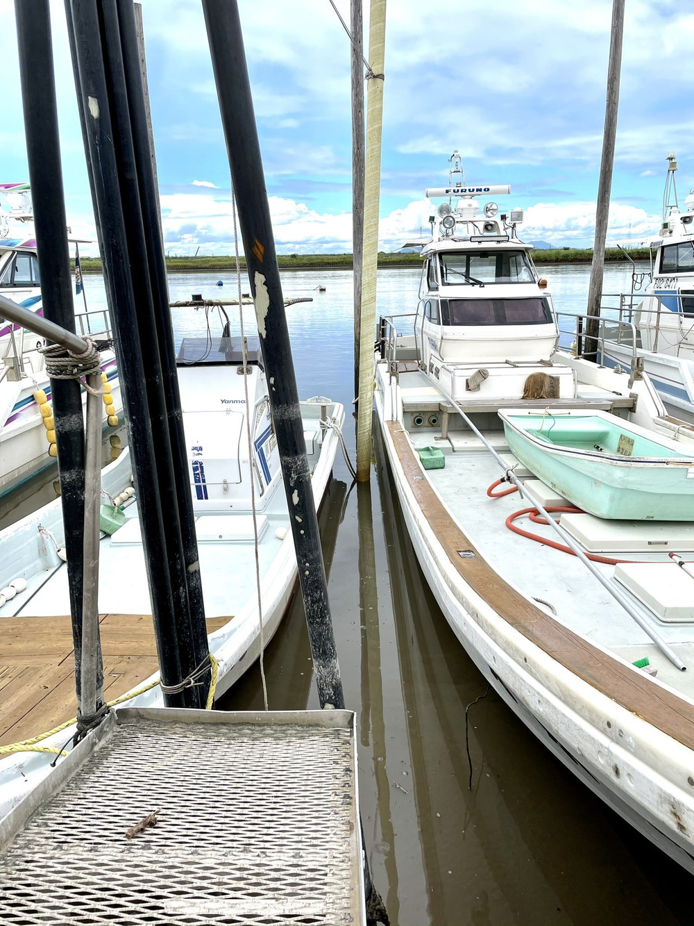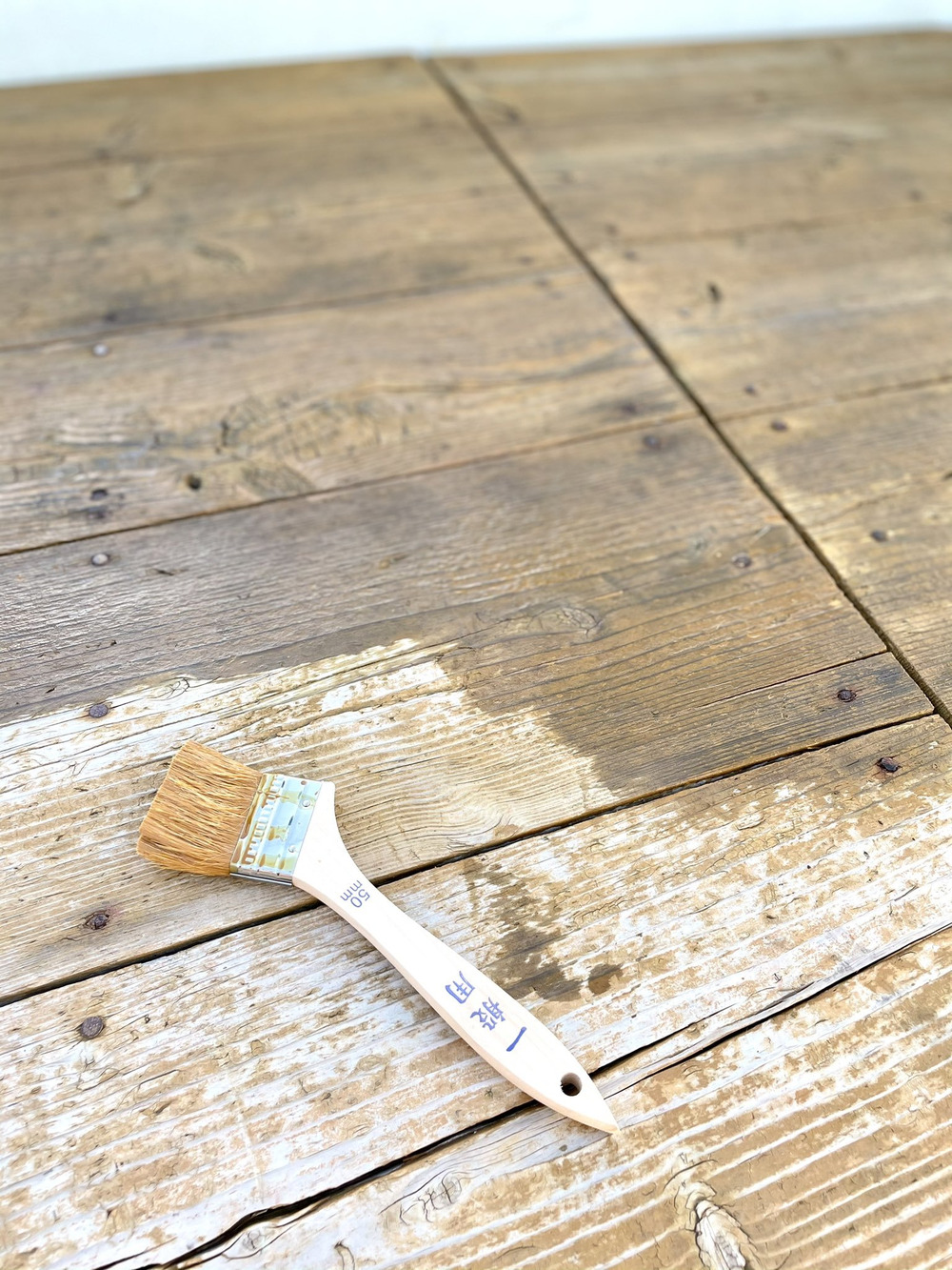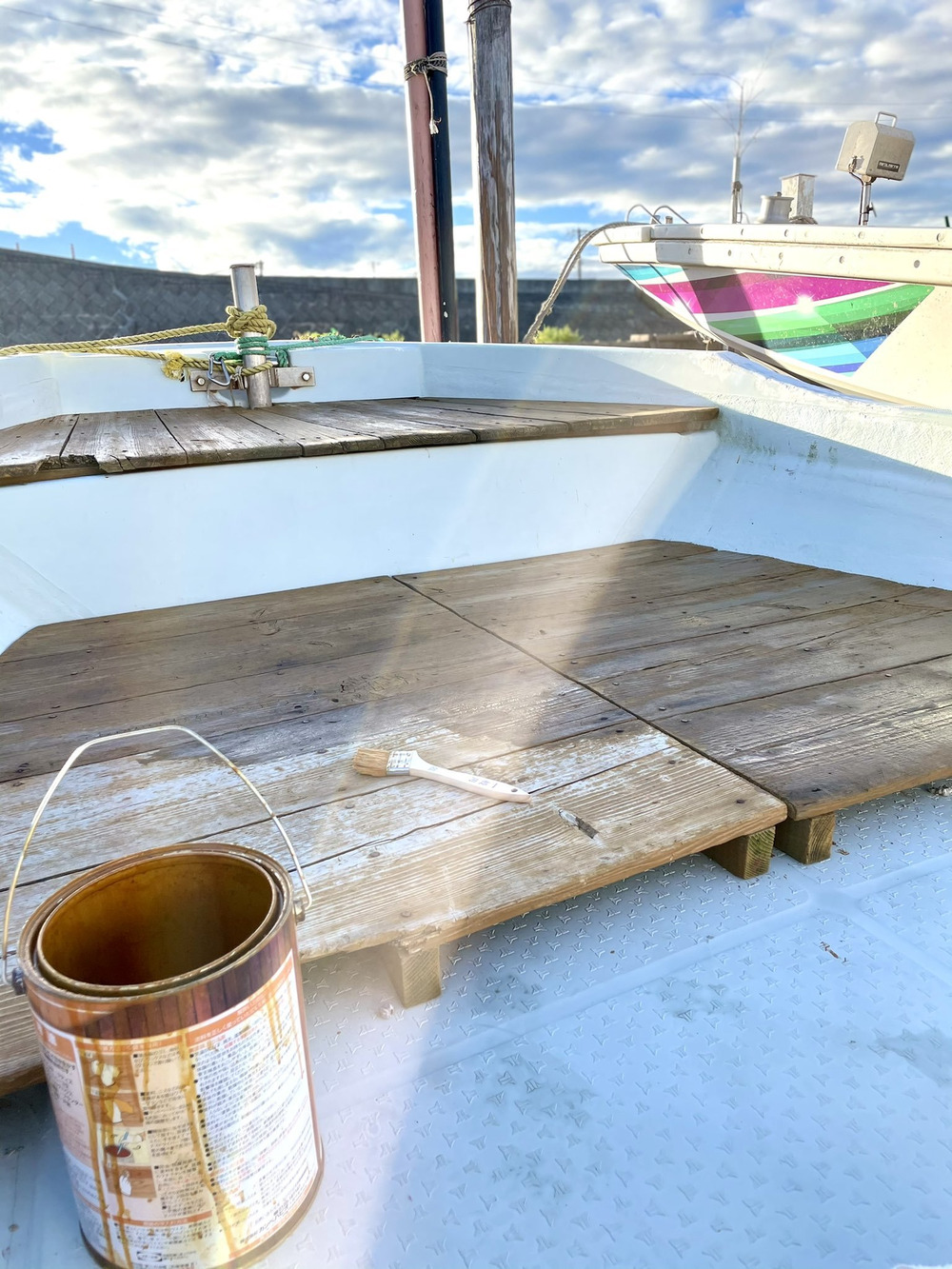 今朝は早朝の涼しい時間から、船の木製の部分に保護用の塗料を塗りました。